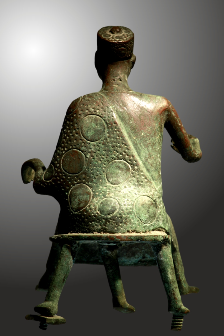 Grosses Asenfigurenpaar aus gegossener Bronze in der verlorenen Form auf Hockern sitzend mit HalsKetten und ornamentierter Kleidung