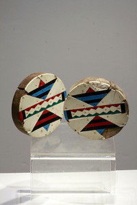 Ohrenpflöcke aus Holz mit aufgenagelten Bakelitmustern, ca 8cm Durchmesser