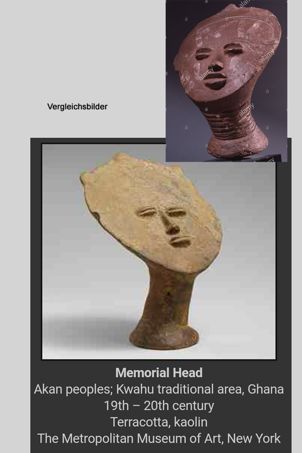 Gedenkköpfe wie dieses Beispiel haben ein mindestens 400-jähriges Erbe unter den Akan in Ghana, wo sie die Gefolgsleute oder ein allgemeines Porträt eines wichtigen Ältesten darstellen, entweder männlich oder weiblich. Sie wurden nicht auf dem Grab aufgestellt, sondern entweder in einem heiligen Hain in der Nähe des Friedhofs oder in einem Schrein oder Stuhlraum, wo gelegentlich Trankopfer und Opfer dargebracht und Rituale durchgeführt wurden.