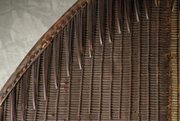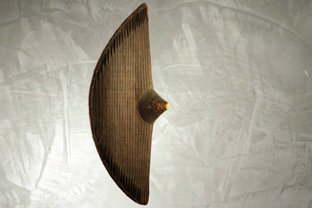 GANDA überflochtenes Holzschild der großen Volksgruppe in Uganda. Die Ganda sind durch ihre formschönen überflochtenen Holzschilde bekannt geworden, die stets spiegelsymmetrisch an ihrer senkrechten Mittelachse abgewinkelt, und mit einem Buckel ausgestattet sind. Aus bekannter Schilder-Sammlung. Herkunft: Uganda