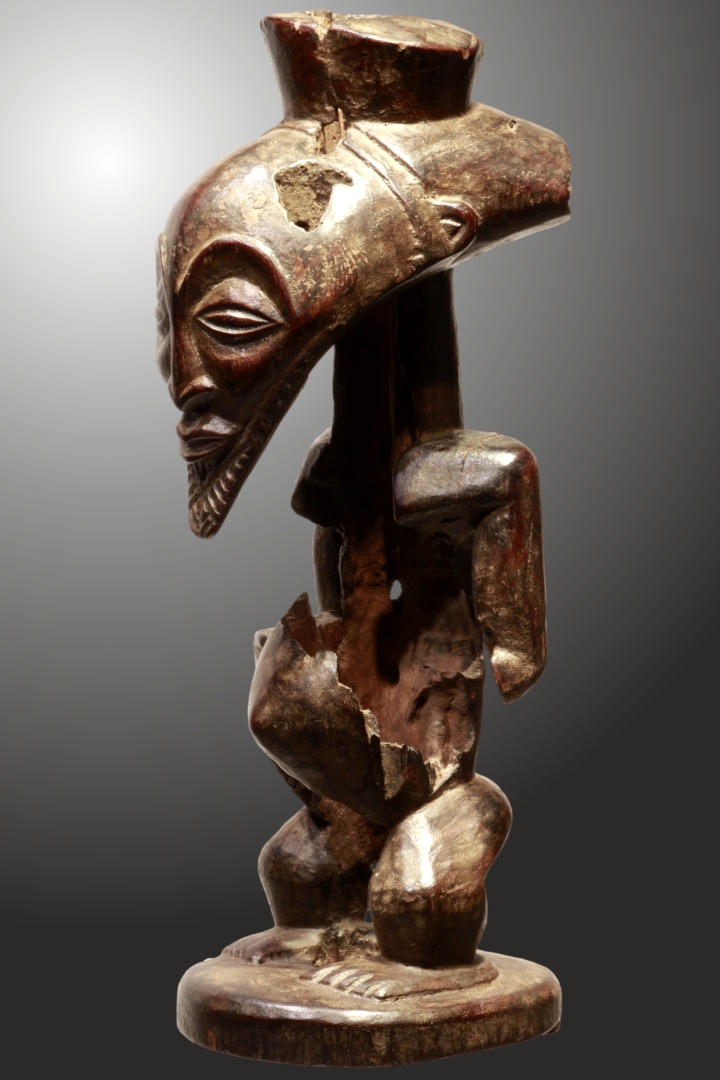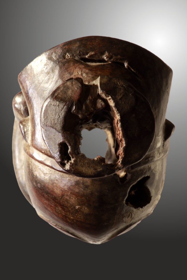 Diese von innen von Termiten zerfressene Figur aus schwerem Holz ist nur noch als Fragment erhalten.