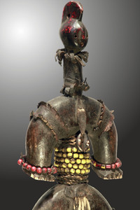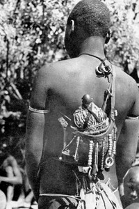 Holz, Leder, Perlen, Raffiaschnüre, Farbreste...   Bei den Namji (auch Namchi oder Dowayo genannt) schenkt ein junger Mann seiner Verlobten so eine Puppe. Sie ist aus Holz geschnitzt und zeigt die ‘klassische’ Form: Gerade und steif stehend, mit abgewinkelten Armen und Beinen. Die vorliegende Namji-Puppe ist mit Raffia- und Leder-Streifen umwickelt und reich geschmückt. Der kleine Kopf ist typisch bei alten Puppen. Das angehängte Amulett-Säckchen aus Leder soll der Frau Schutz gewähren.