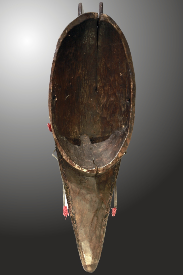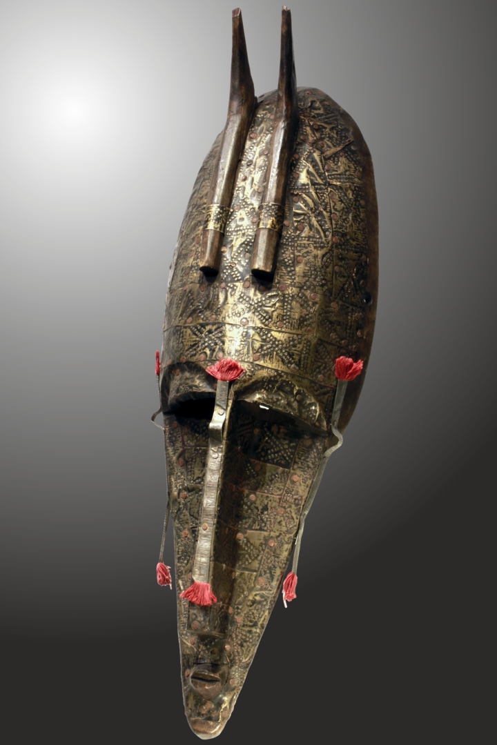 Die Maske vereint menschliche und tierische Attribute und ist mit fein punziertem Messing beschlagen
