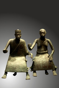 Grosses Asenfigurenpaar aus gegossener Bronze in der verlorenen Form auf Hockern sitzend mit HalsKetten und ornamentierter Kleidung