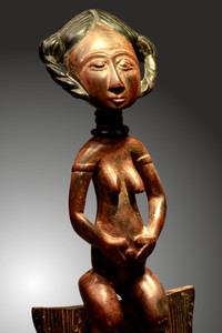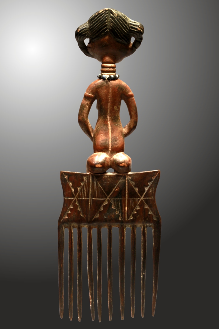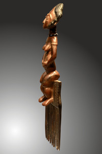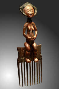 |  | ASHANTI Prunkkamm mit weibl. Figur, 43,5cm, ehem Slg Prof.Dr. Peter Maul, 250,-€  PRUNKKAMM mit vollplastisch ausgeschnitzter weiblicher Figur. Braune Patina, Haare schwarz,